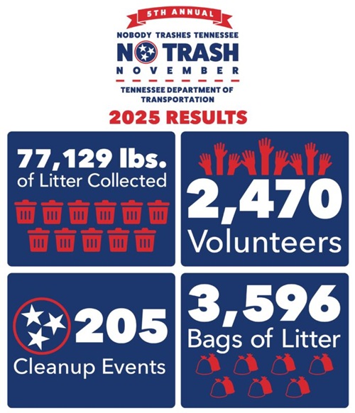 More than 77,000 pounds of litter were removed from roadsides and waterways statewide as part of the 5th Annual “No Trash November” month-long campaign sponsored by the Tennessee Department of Transportation.